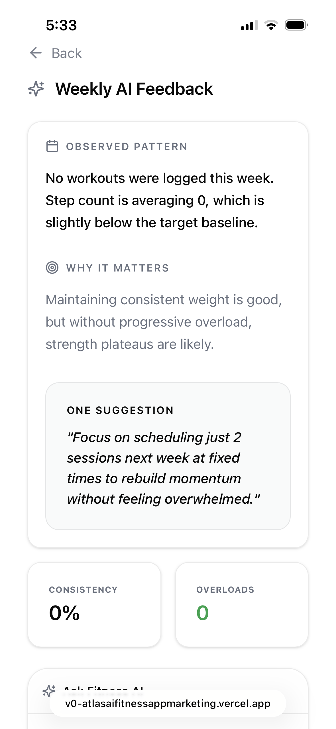 Every week Atlas analyzes all your data and tells you what worked, what didn't, and exactly what to focus on next. Like a coach reviewing your week with you.